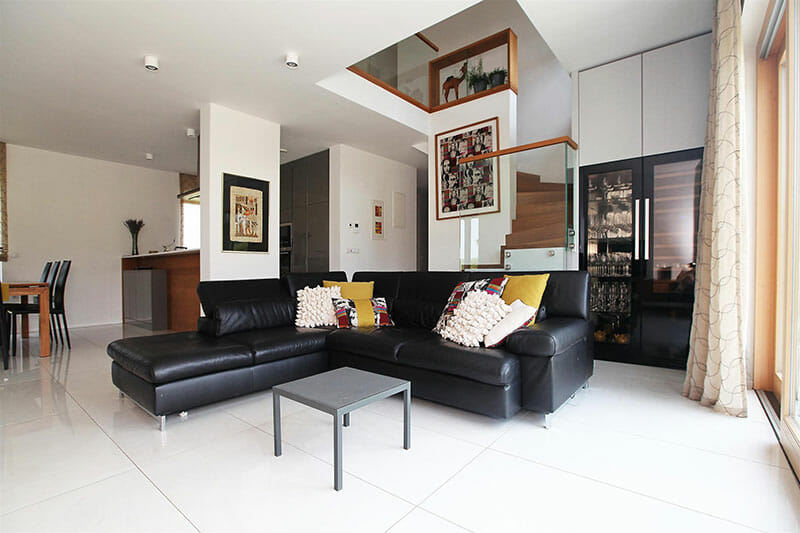 Družinska hiša pa je – kljub temu, da se po barvi fasadnega ovoja popolnoma sklada s svojo poslovno sosedo – znotraj bolj razgibana in bolj odprta navzven. Vsi pritlični prostori so povezani z bivalnim vrtom, najbolj pa nas pritegne dvovišinska dnevna soba. V nadstropje so umeščene spalnice, v katerih najbolj uživajo otroci, ki imajo na podestih pod streho urejene igralne kotičke.